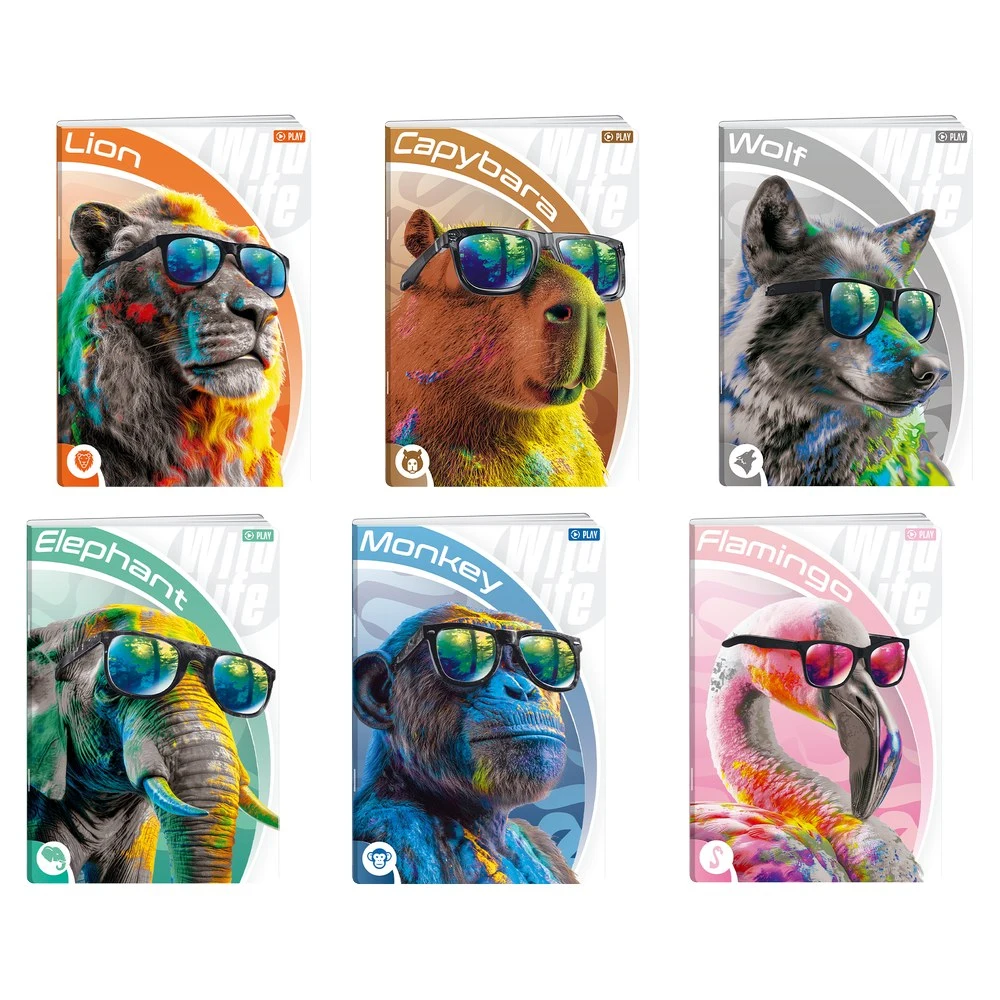 Premium 40 notebook, A5, double line ruling, 40 sheets. Wild life series features six eye-catching covers—Lion, Capybara, Wolf, Elephant, Monkey, Flamingo—with vibrant color accents and sunglasses for strong shelf appeal. Compact A5 format suited to daily note-taking.