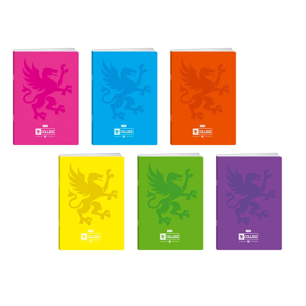 Premium 40 notebook with PP cover in vibrant assorted colors and a bold griffin design. A5, lined, 40 sheets. College series branding. Staple-bound for dependable use. Eye-catching shelf appeal and durable materials make it a strong seller for education and office ranges.
