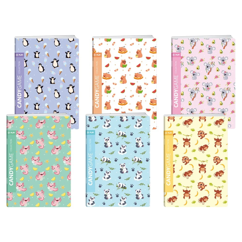 Premium 50, notebook, A4, double line, 50 sheets. Candygame collection with assorted pastel covers featuring playful animal motifs—penguins, bears, koalas, pigs, pandas, monkeys—drives strong shelf appeal. A4 size and double-line ruling support tidy, structured writing.