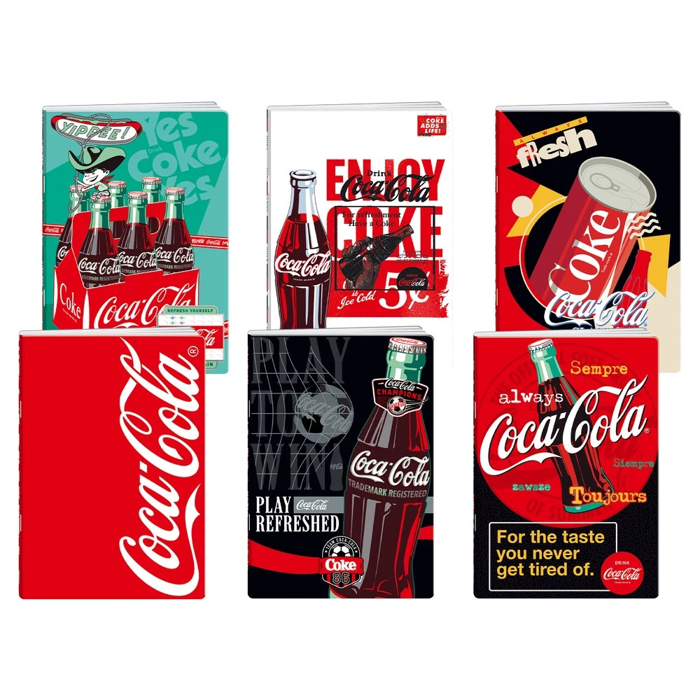Premium 50 notebook, A4 with 50 squared sheets. Assorted Coca‑Cola covers with bold, retro graphics deliver strong shelf impact. Grid pages support clear writing. Multiple designs enhance merchandising flexibility. A trendy, giftable choice for brand-led displays.
