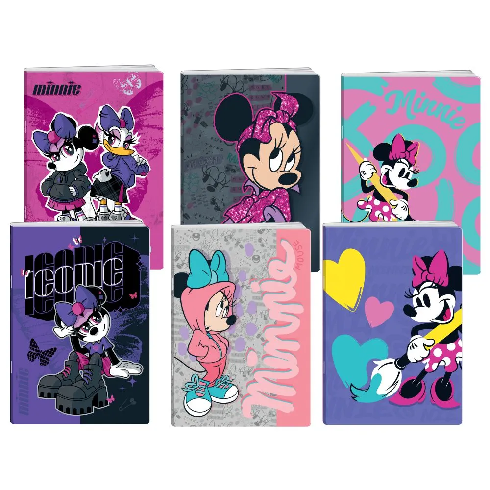 Premium 50, notebook with glitter, Minnie Mouse, A4, blank, 50 sheets. Trendy glitter-accented covers with vibrant Minnie graphics drive strong shelf appeal. A4 format with 50 blank sheets suits notes, planning, or sketching. Assorted designs maximize sell-through.