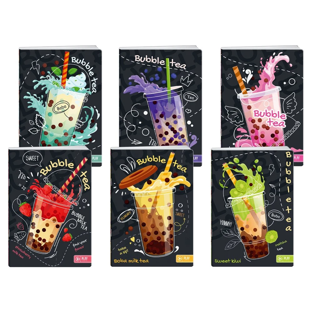 Premium 50 A4 notebook with UV‑varnished cover featuring trendy Bubble Tea artwork. Lined pages, 50 sheets. Glossy finish boosts color depth and shelf appeal. Modern design targets youth and lifestyle ranges, ideal for school and gift assortments. Assorted cover designs.