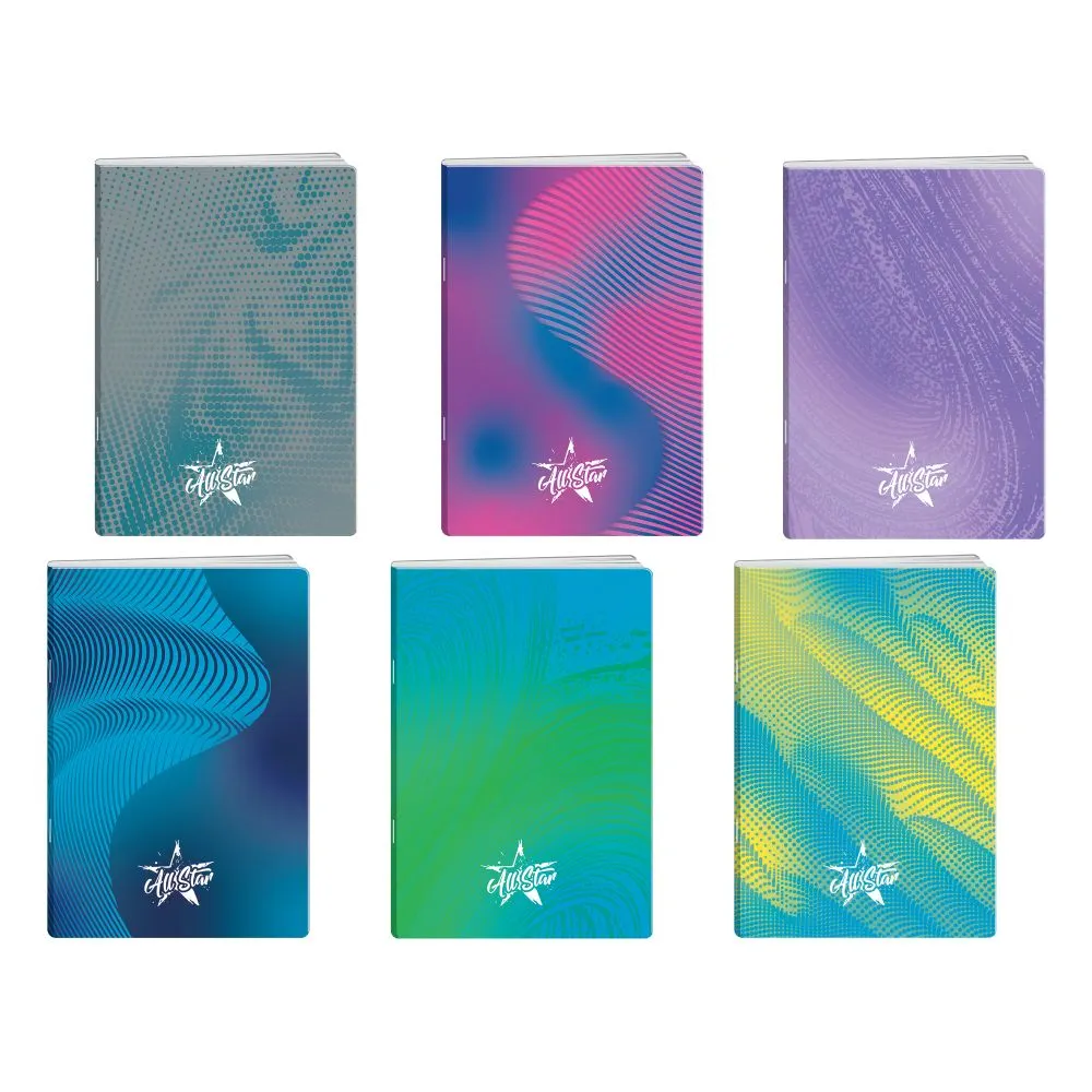 Premium 50 All Star notebook, A5, double line, 50 sheets. Trendy gradient covers finished with UV varnish for a glossy, scuff-resistant appearance. Staple bound for practicality. Assorted designs boost shelf appeal and easy mix-and-match for school, office, or promotional sets.