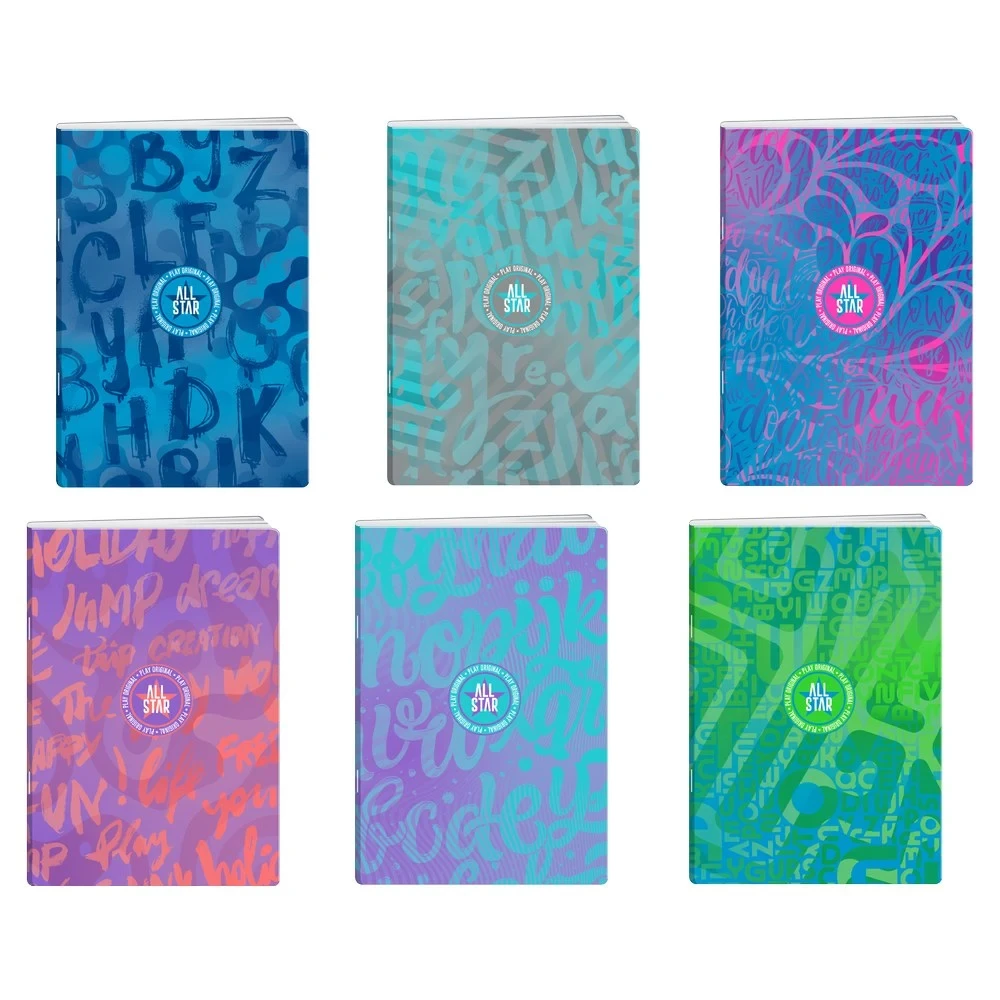 Premium 50 All Star notebook designed for modern merchandising: A5 size with 50 sheets and double-line ruling. UV-varnished covers feature vibrant, abstract gradients for added gloss and protection. Secure staple binding. Trend-forward choice for schools and offices.