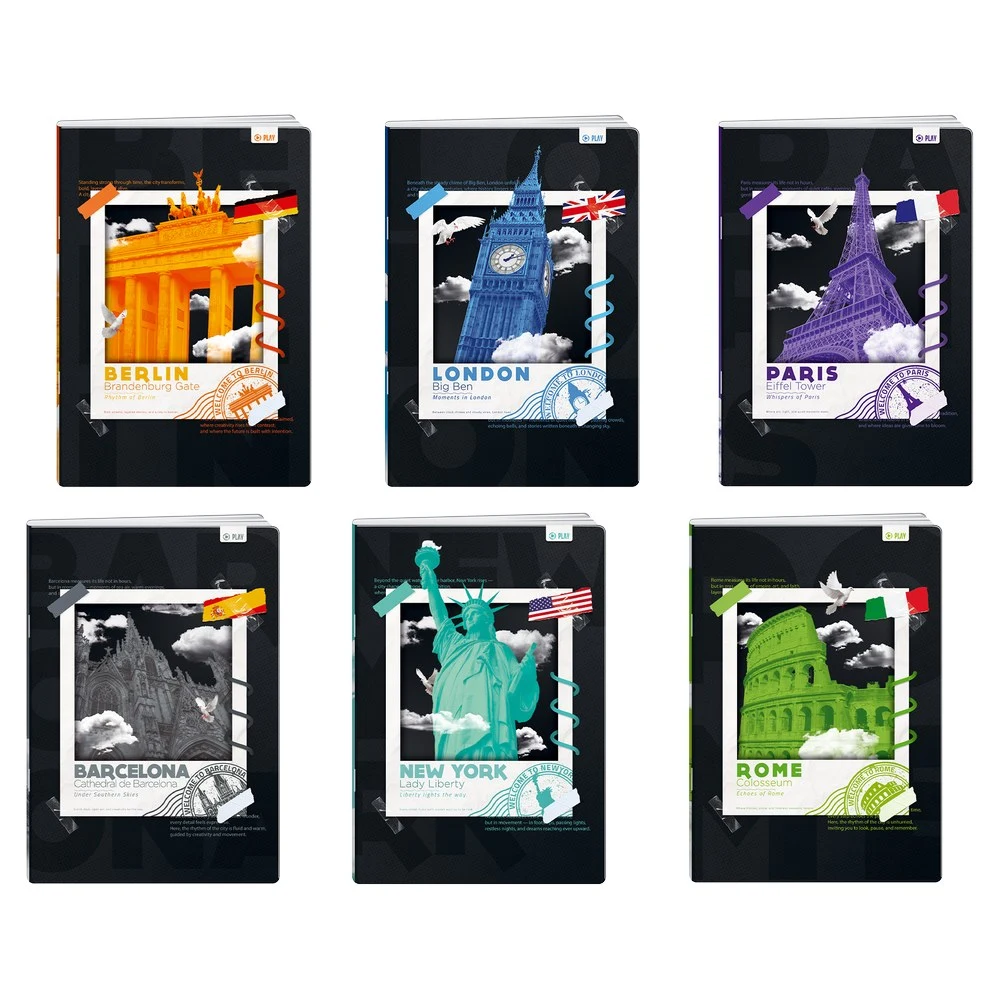Premium 50 A5 squared notebook, 50 sheets, with UV-varnished cover. City by night series shows bold landmark art from Berlin, London, Paris, Barcelona, New York and Rome. Robust finish and crisp square ruling ensure quality and shelf appeal for office and retail.
