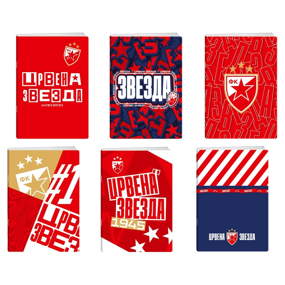 Premium 50 A5 lined notebook with UV varnish cover featuring bold Crvena zvezda graphics. 50 sheets. Trend-forward designs offer strong shelf appeal, while the UV finish adds gloss and wear resistance. Assorted covers shown, ideal for school supplies and fan merchandise assortments.