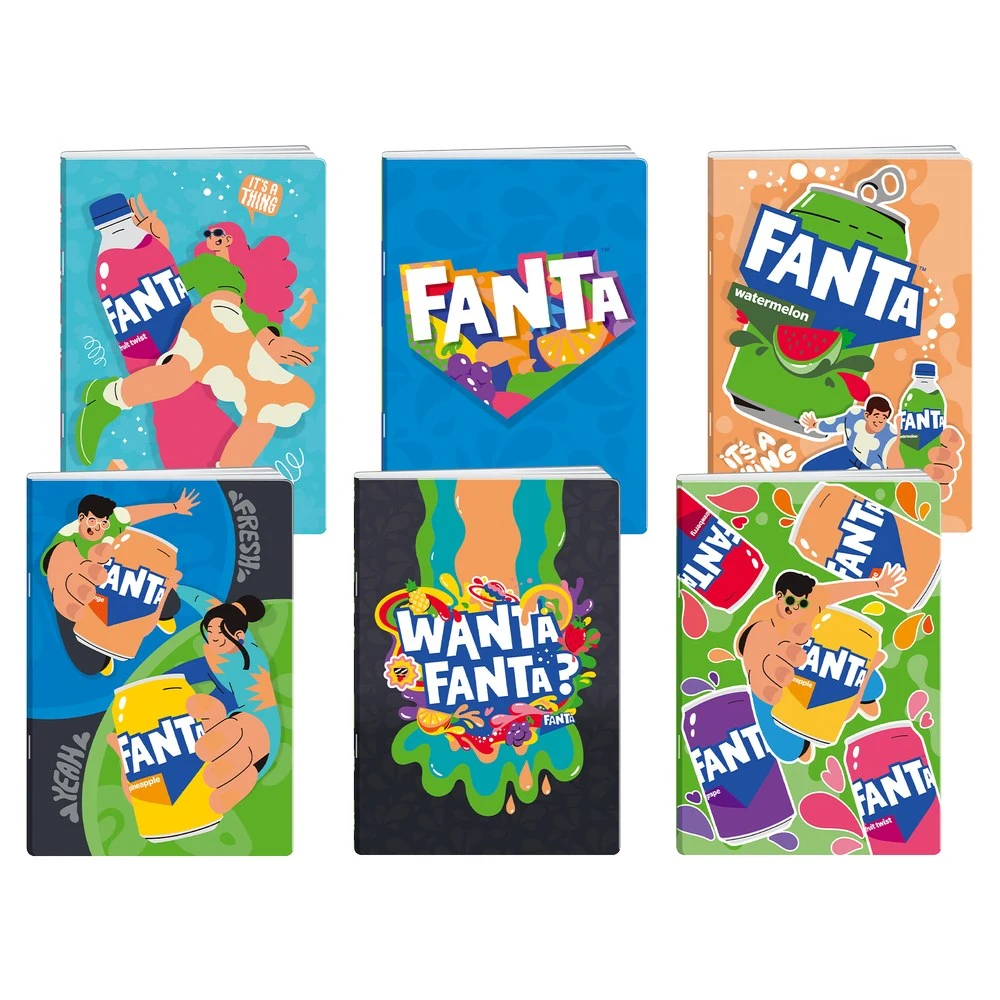 Premium 50, A4 notebook with UV varnish and double-line ruling, 50 sheets. Trendy Fanta-themed covers in assorted designs deliver high shelf impact. UV-coated cover enhances gloss and helps resist scuffs. Smooth paper supports everyday writing—reliable for school and office assortments.