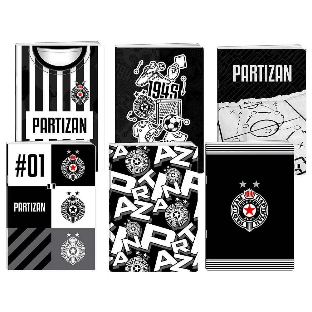 Trendy A4 notebook with Partizan black-and-white covers and UV‑varnished finish for a sleek, durable look. Includes 50 blank sheets for notes or sketches. Assorted motifs—stripes, typography, pitch diagram—deliver strong shelf presence and premium merchandising appeal.