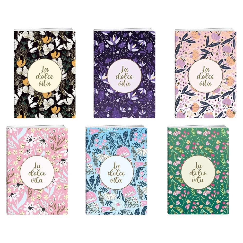 Premium 60 A5 notebook with UV-varnished cover and 60 blanco sheets. Trendy floral covers with La dolce vita motif; the glossy UV layer boosts color and resists scuffs. Assorted designs deliver strong shelf appeal, ideal for gifting, merchandising, and everyday note-taking.