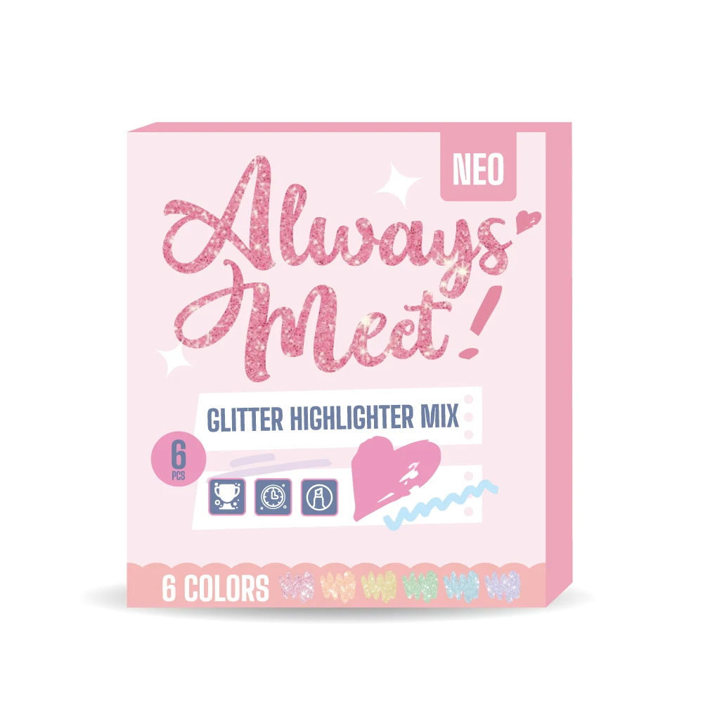 Rainy glitter highlighter set, 6pcs mix. Sparkling ink colors with chisel tips for broad strokes or precise lines—suited to notes, planners, and creative accents. Trendy pastel palette and eye-catching, retail-ready packaging support strong shelf appeal in stationery and gift assortments.