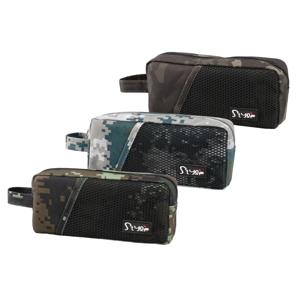Rivera 207, pencil bag, Military: trendy camo design with textured black mesh front and Style logo. Rectangular zip-closure pouch with side carry loop for easy handling. Retail‑ready look that drives sell-through in school and office ranges, offered in assorted camo tones.