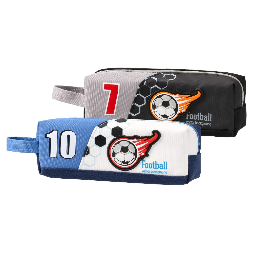 Rivera 212, pencil case, Fire ball. Trendy football theme with flaming ball graphic and bold player numbers. Made of durable fabric with a smooth top zipper and a side handle. Boxy shape organizes pens and small accessories. Eye-catching colorways maximize shelf impact for school retail.