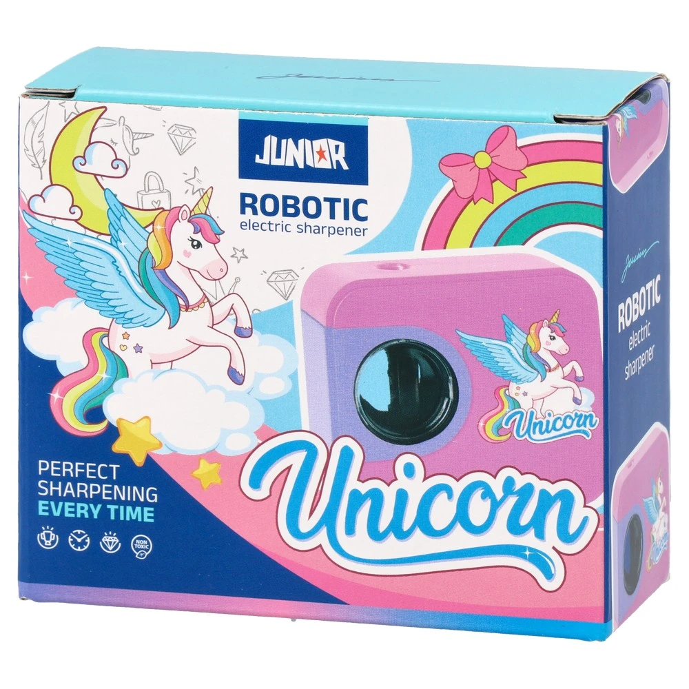 Robotic, electric sharpener, unicorn. Compact electric pencil sharpener in bright pink with lilac trim and a clear viewing window. Durable plastic housing with visible metal cutter. Unicorn graphic boosts shelf appeal for school and gift retail. Trend-forward, kid-friendly design.
