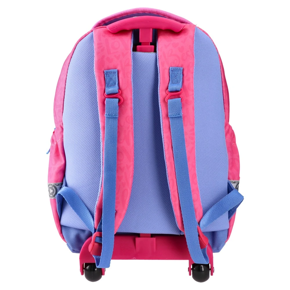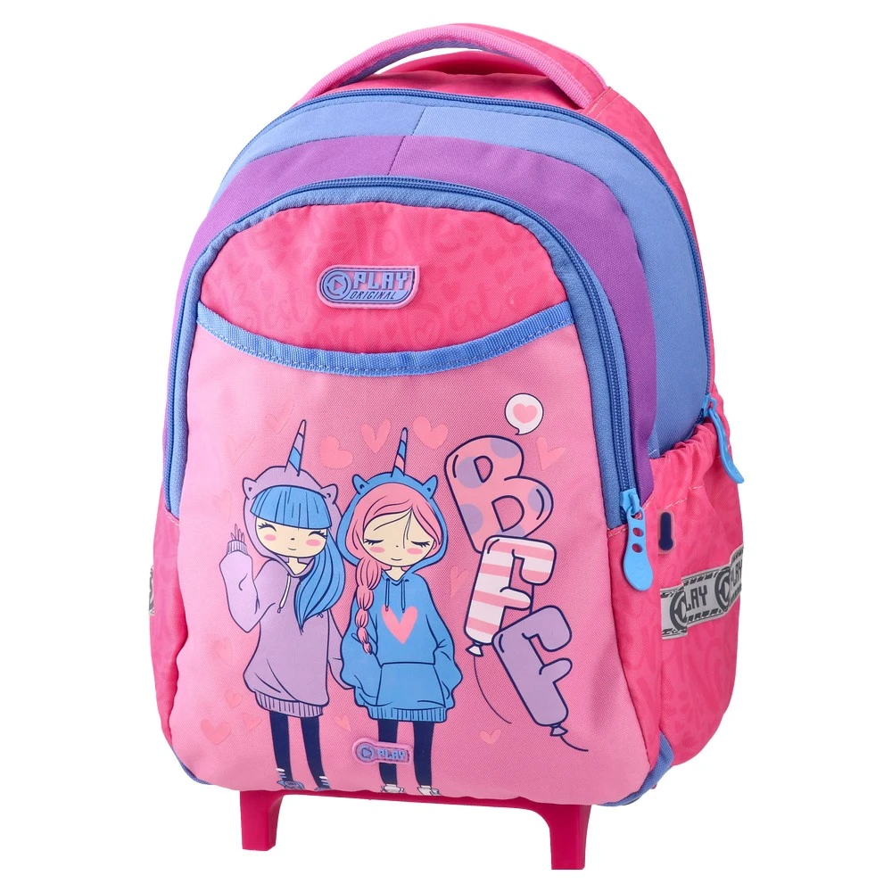 Rolly, preschool backpack, BFF: Trendy pink and purple colorblocking with a BFF character print. Sturdy fabric and smooth zippers. Two main compartments, a front zip pocket, and a side pocket for organization. Padded top handle and stable base feet support daily preschool use.