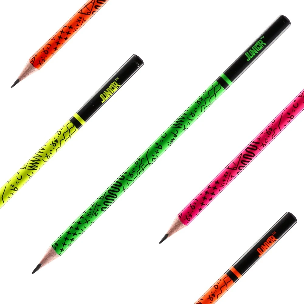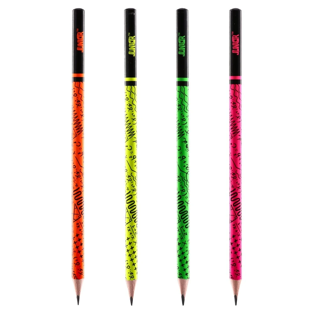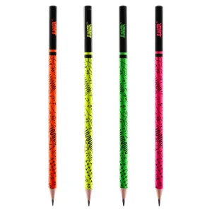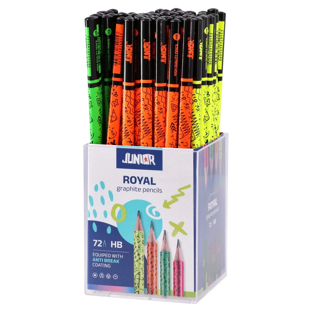 Royal, pencil, HB. Trendy neon body with graphic patterns for standout merchandising. Quality wooden barrel with glossy lacquer; HB graphite provides smooth, medium-dark lines for writing and sketching. Sharpened tip and sturdy wood ensure clean sharpening and everyday durability.