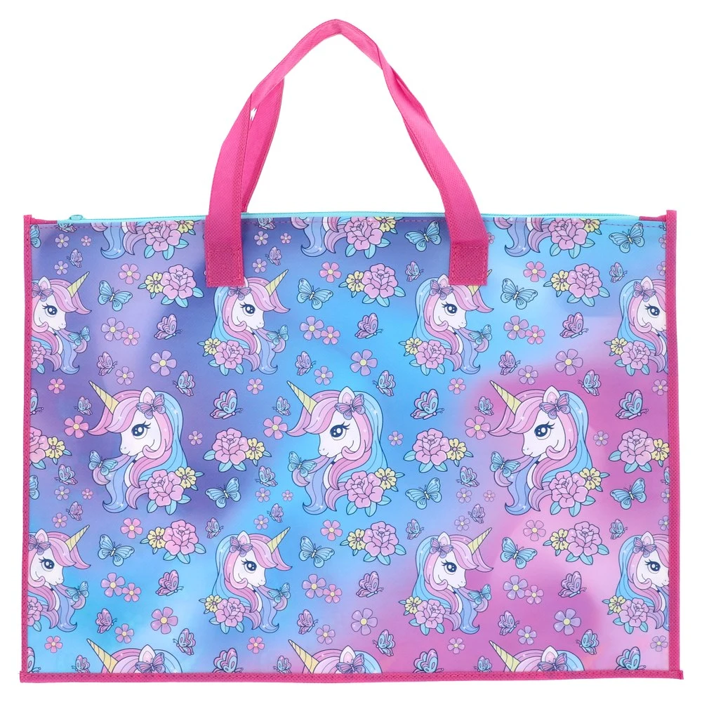 SB04 drawing pad bag, Unicorn. Trend-led gradient blue‑pink print with repeating unicorns, flowers and butterflies. Top zip closure, twin pink carry handles and reinforced edging. Practical carrier for drawing pads and school artwork with strong, neat construction for high retail appeal.