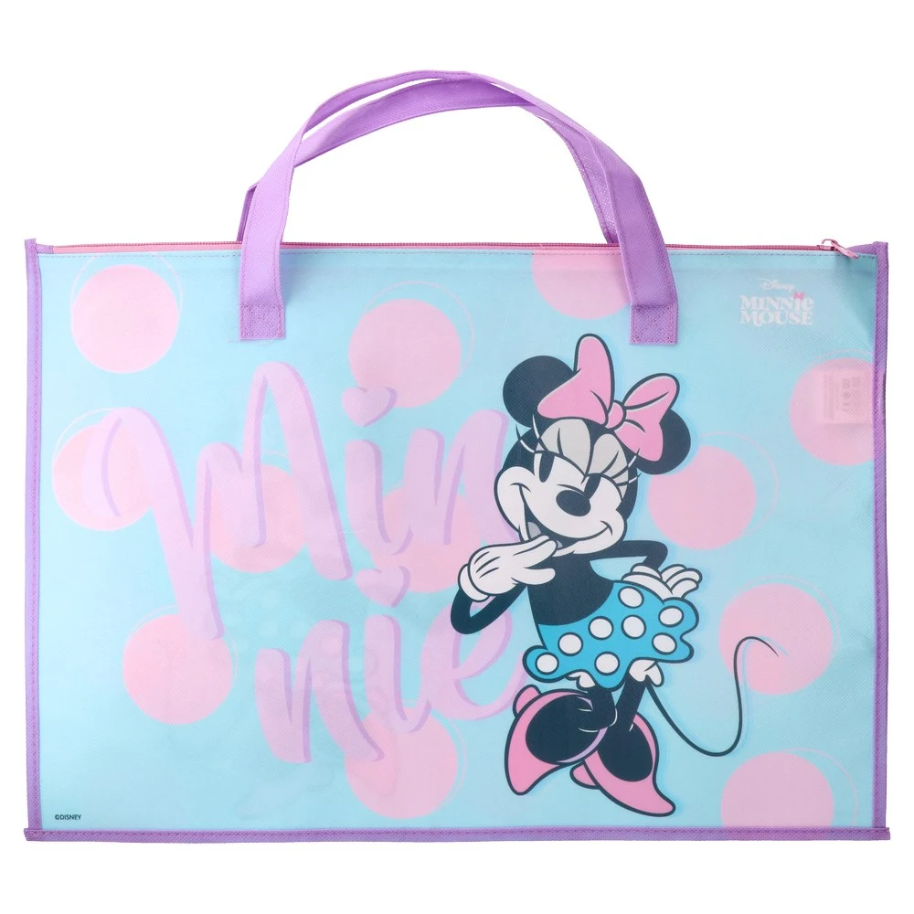 SB05 drawing pad bag, Minnie Mouse, Pastel. Fabric carry bag with zip closure and stitched dual handles. Pastel blue with pink polka dots and Minnie graphic for standout shelf appeal. Designed to protect and transport drawing pads and light art tools; bound edges.