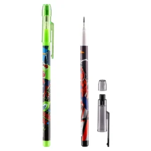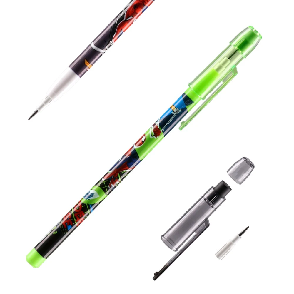 Trendy non-sharpening pencil featuring a plastic barrel wrapped in vivid Spider-Man graphics. Graphite tip delivers clean lines with no sharpening or mess. Includes protective cap and pocket clip. Bright green accents elevate shelf appeal across school and stationery assortments.