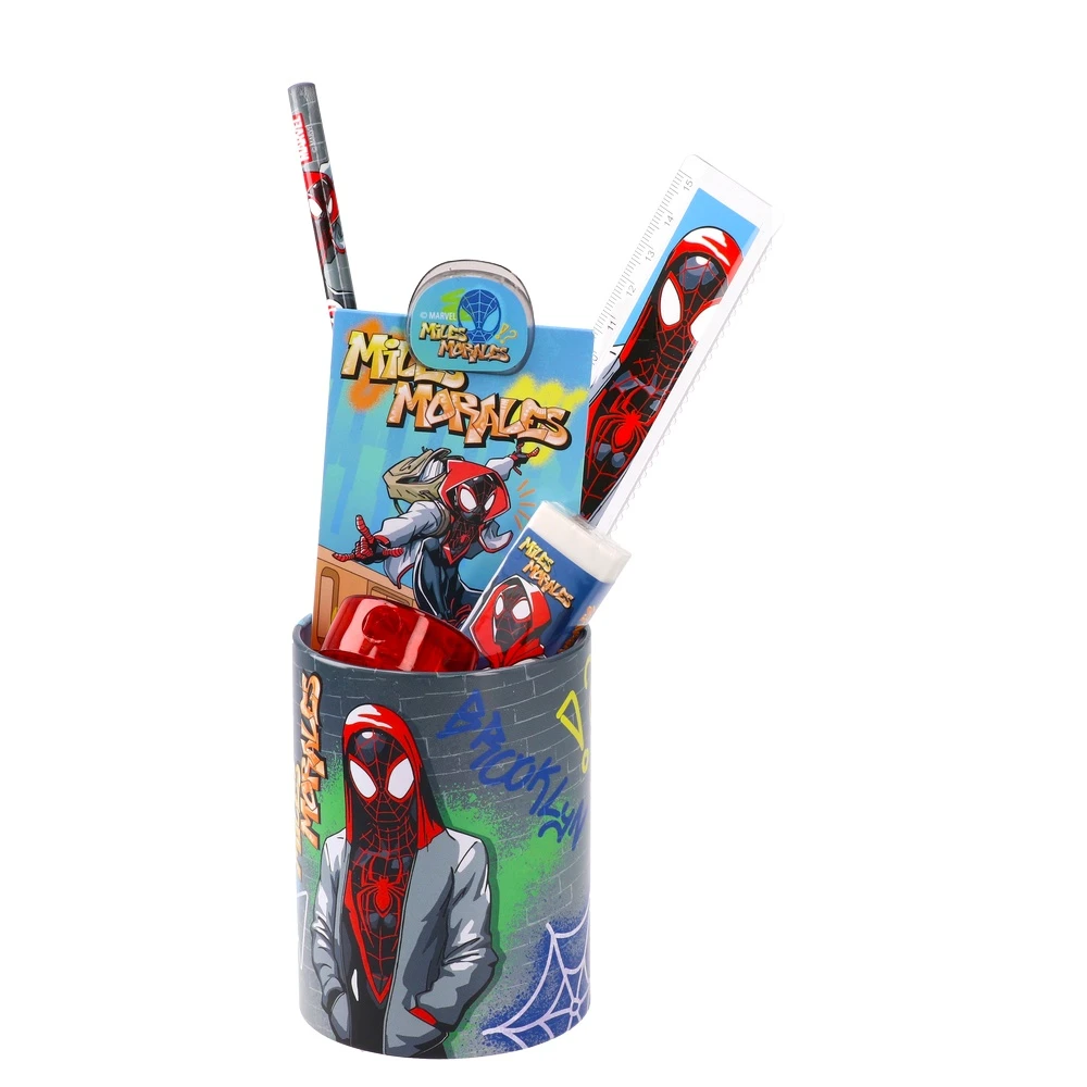 Trendy school set presented in a sturdy cup with Spider-Man: Miles Morales graphics. Includes matching pencil, ruler, eraser and sharpener for everyday classroom use. Vivid print and coordinated pieces enhance shelf appeal. Compact, ready-to-display format ideal for back-to-school sales.