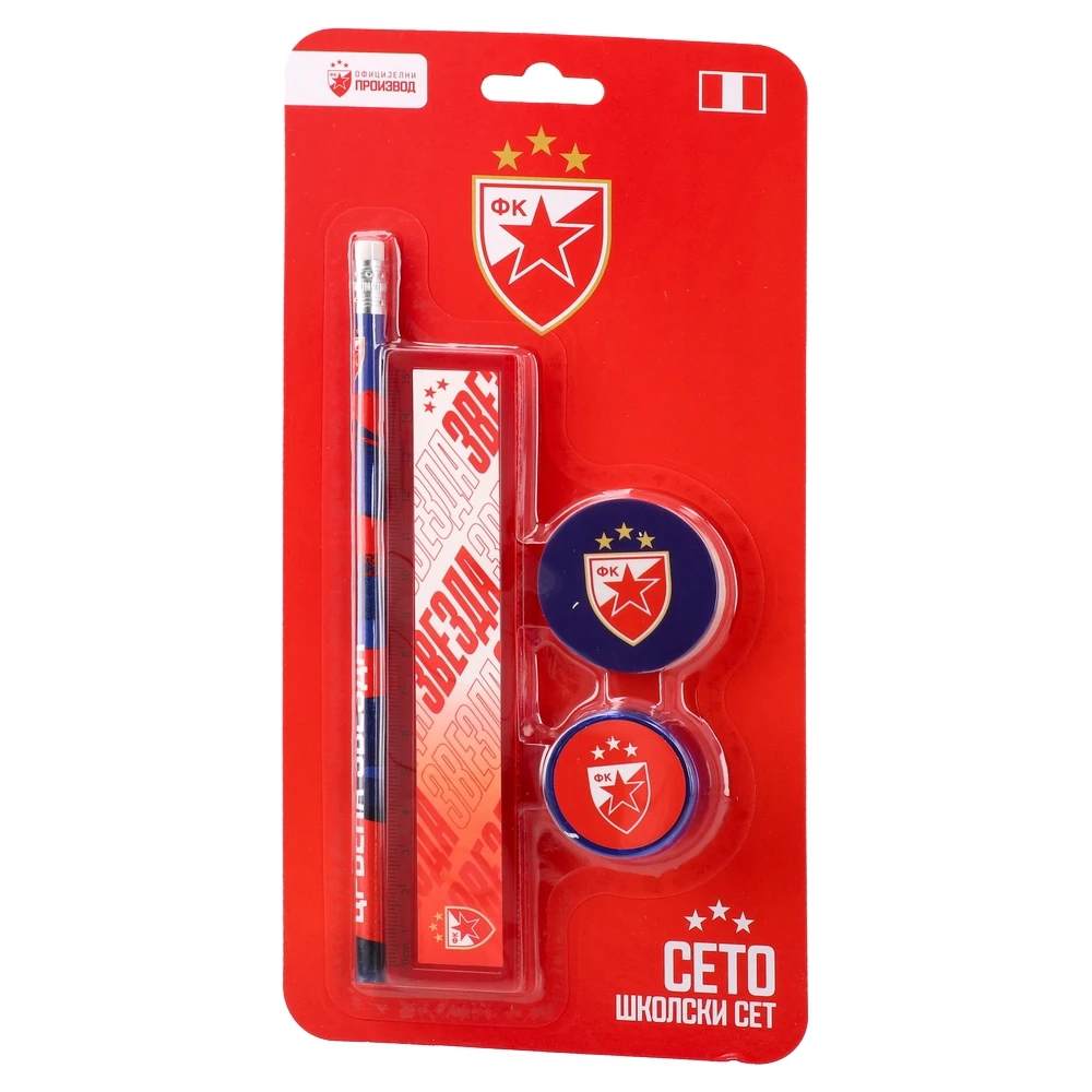 Four-piece school set with Crvena zvezda branding. Includes pencil, ruler and two round accessories, each with the club crest. Trendy red/blue look drives impulse buys. Packed on a hang-ready blister card for clean presentation—ideal for club stores and back-to-school assortments.
