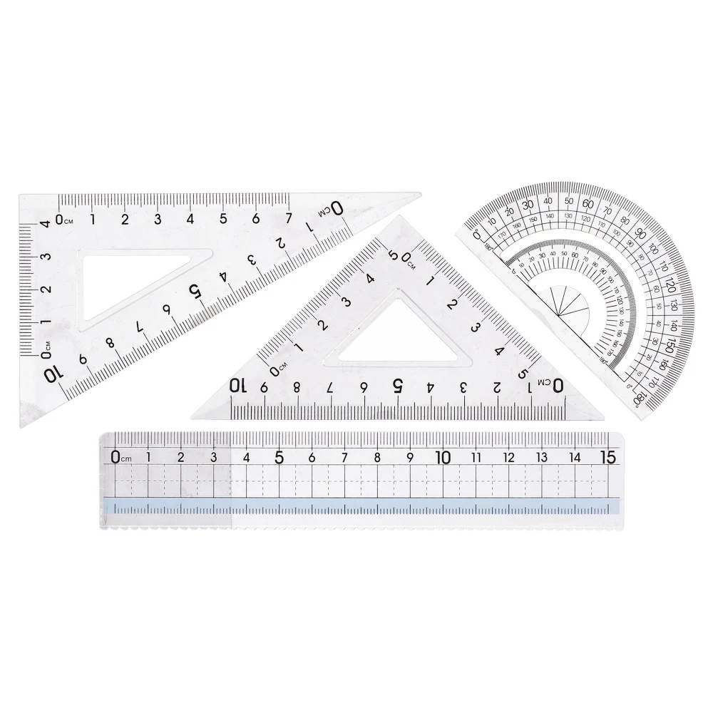 A 4-piece transparent geometry set featuring a 15 cm ruler, 180° protractor and two set squares. Sleek clear design with crisp metric graduations for accurate reading. Durable, classroom-ready quality suited for schools, offices and supply kits.