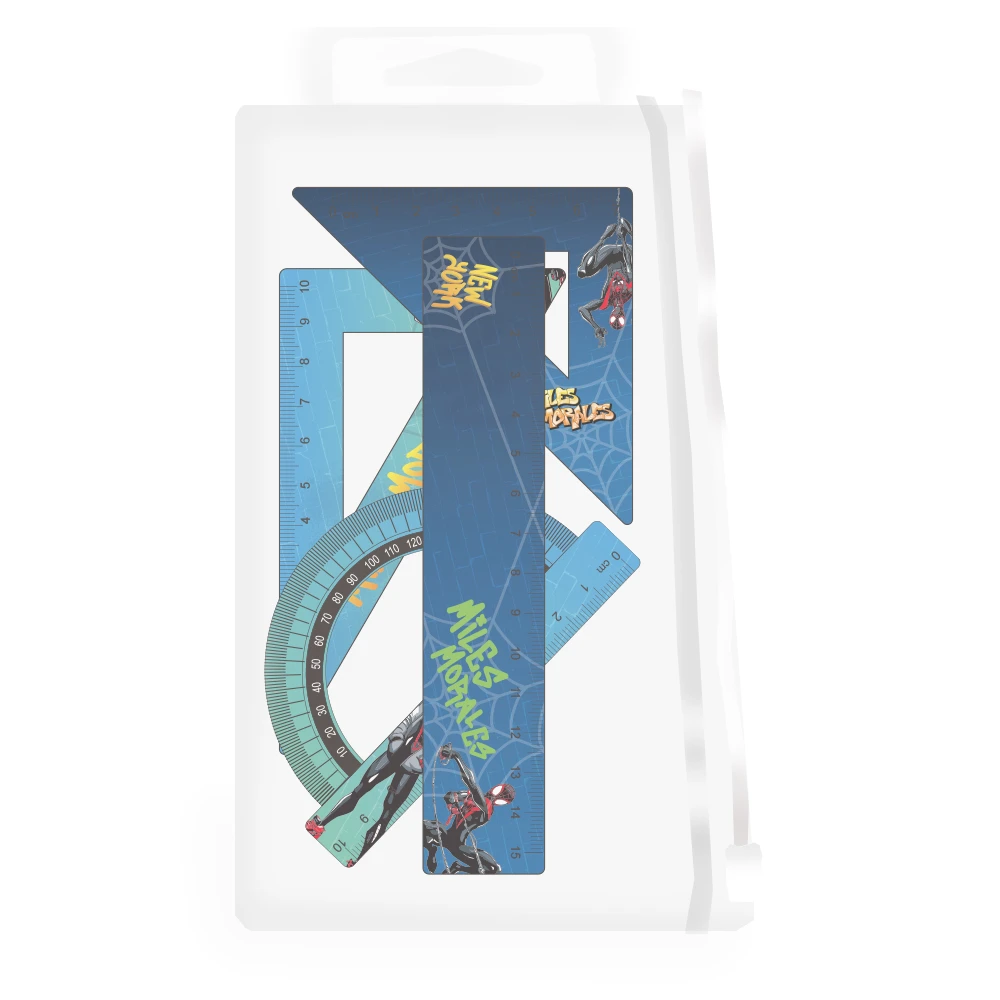 Complete school geometry set featuring a 15 cm ruler, two set squares and a 180-degree protractor with vivid Spider-Man graphics. Clear metric graduations aid accuracy. Supplied in a resealable EVA pouch with carry handle, protecting contents and enhancing shelf presentation.