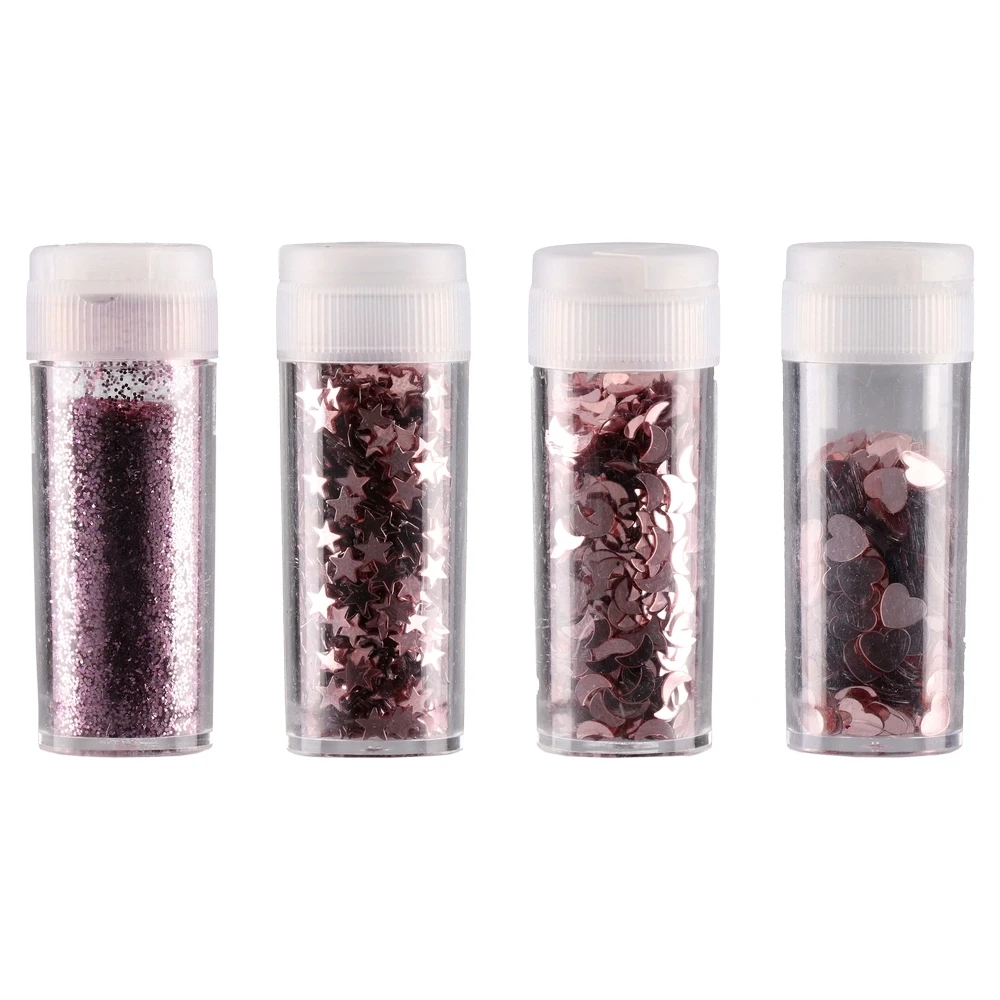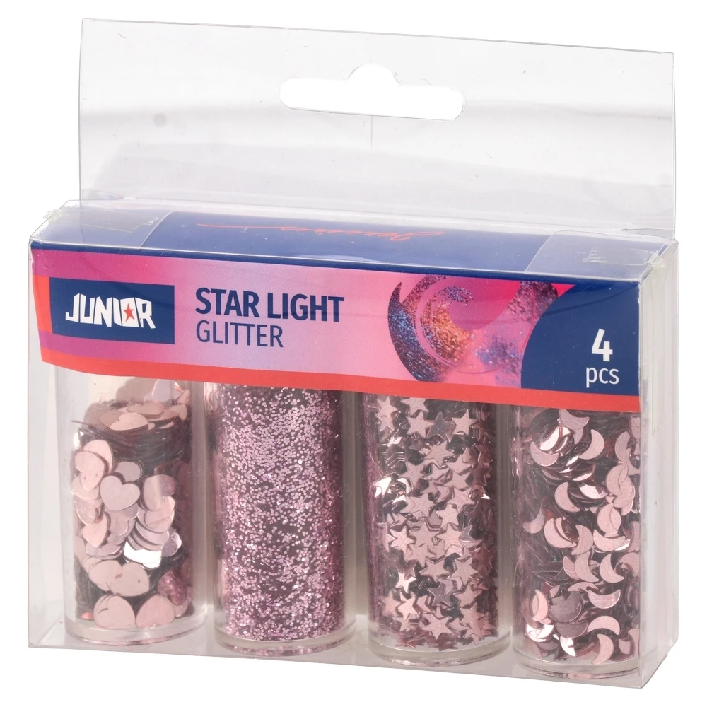 Star light 4, glitter, pink, mix, 4pcs. Assorted pink glitter in clear vials with secure caps: fine glitter plus star, moon and heart sequins. Trendy metallic shine with clean, uniform cuts for even coverage. Versatile for crafts and décor; ready for eye-catching retail displays.