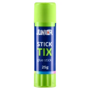 Stick Tix glue stick, 25g. Solid art & crafts adhesive with a modern blue body and bright green cap for high shelf appeal. 25g stick. Display-ready box holds 12 units for efficient merchandising. Cap-secured stick supports clean handling and professional presentation.