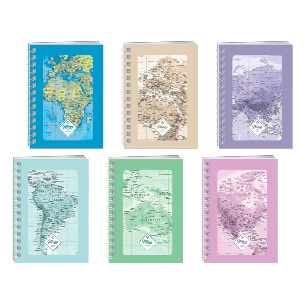 Strong spiral 80 notebook with hard cover and robust spiral binding. A6 for easy carry. 80 squared sheets support neat writing and sketches. Trendy map-themed covers in assorted colors boost shelf appeal. Durable construction suited for daily use across school and office.