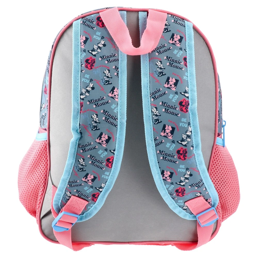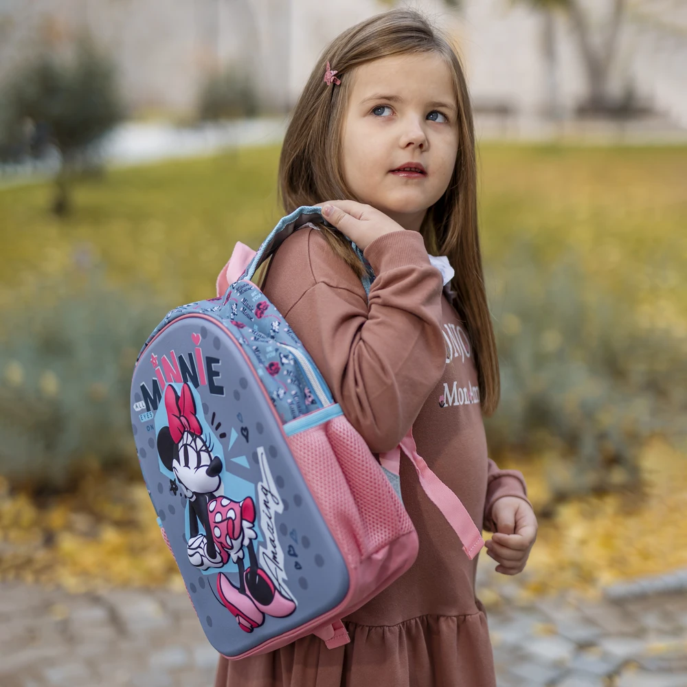 Tico preschool 3D backpack with Minnie Mouse “Fabulous” artwork. Raised character panel, grey base with pink accents and contrast piping create a trendy look. Features a zippered main compartment and two side mesh pockets. High shelf impact for character-led assortments.