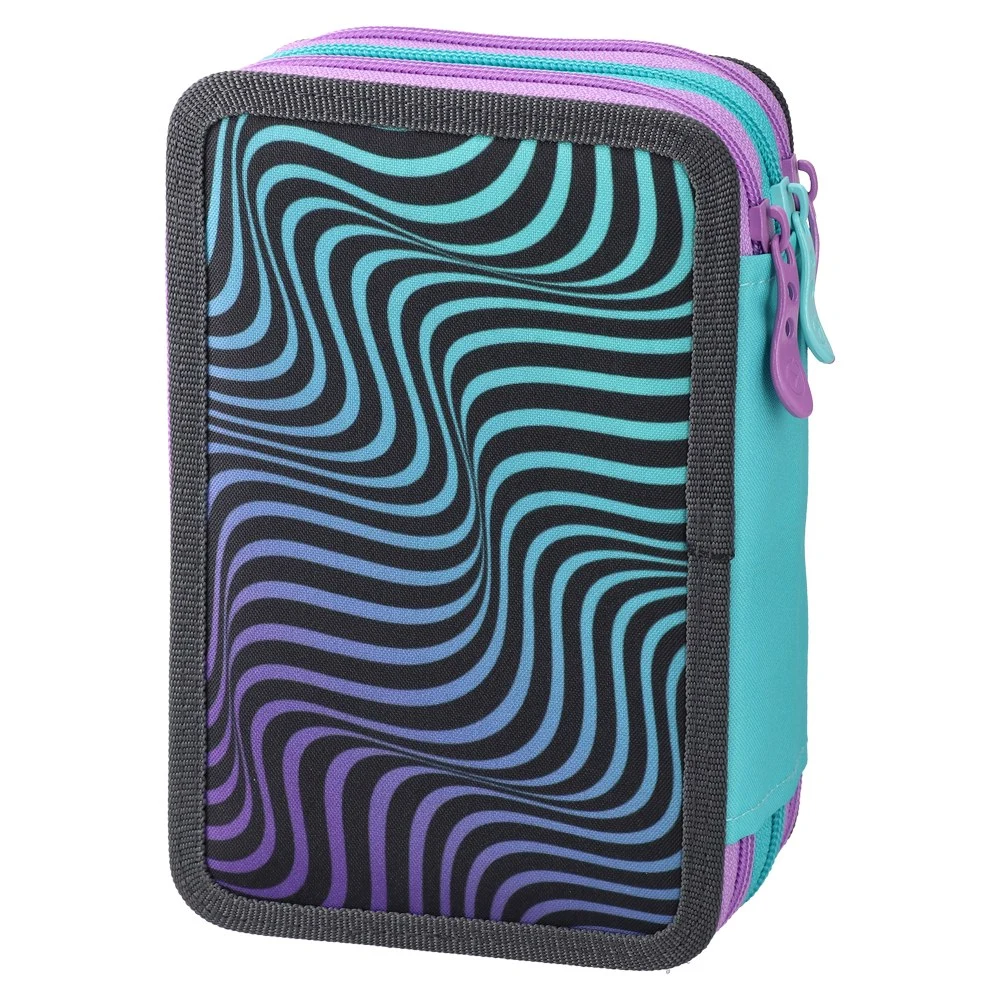 Triple decker, full pencil case, 3 zippers, Star offers efficient organization with three separate zip compartments. Trendy teal-purple cover with star elements and character art boosts shelf appeal. Durable textile shell, reinforced edges, and smooth zips suit daily school use.