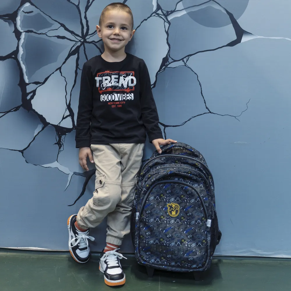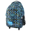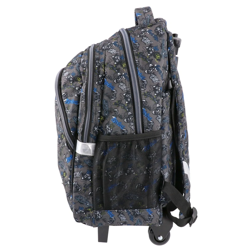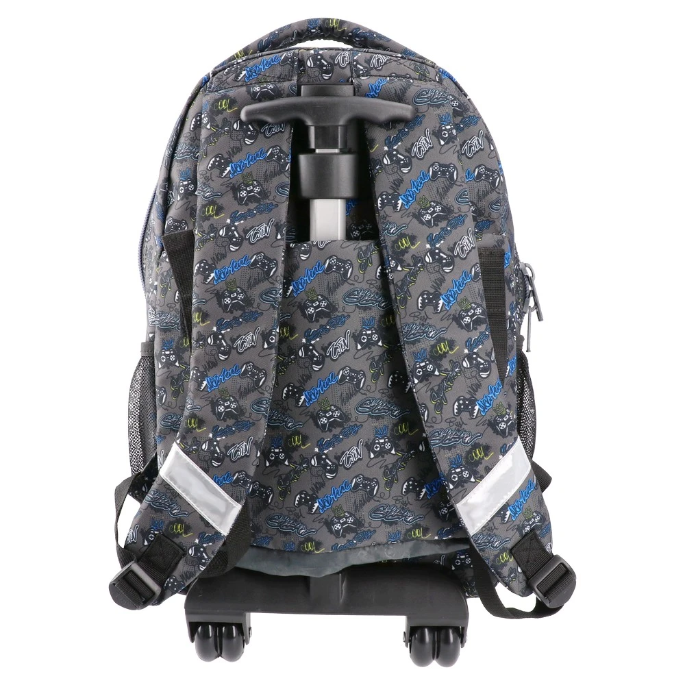 XP Gear trolley backpack with wheels featuring a grey all-over gaming print and logo badge. Durable fabric, multiple zipped compartments, front pocket and mesh side pocket. Stable base feet for upright loading. Front name-label area. Strong shelf appeal for school ranges.