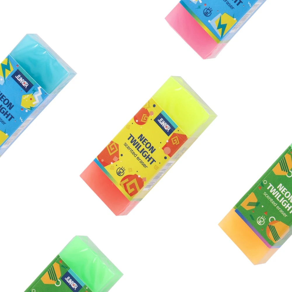Twilight, eraser, small, mix. Compact rectangular block in eye-catching neon two-tone colors. Scented and individually wrapped for tidy merchandising. Crisp edges and clean geometry. Trendy design boosts shelf appeal for school, office and craft assortments.