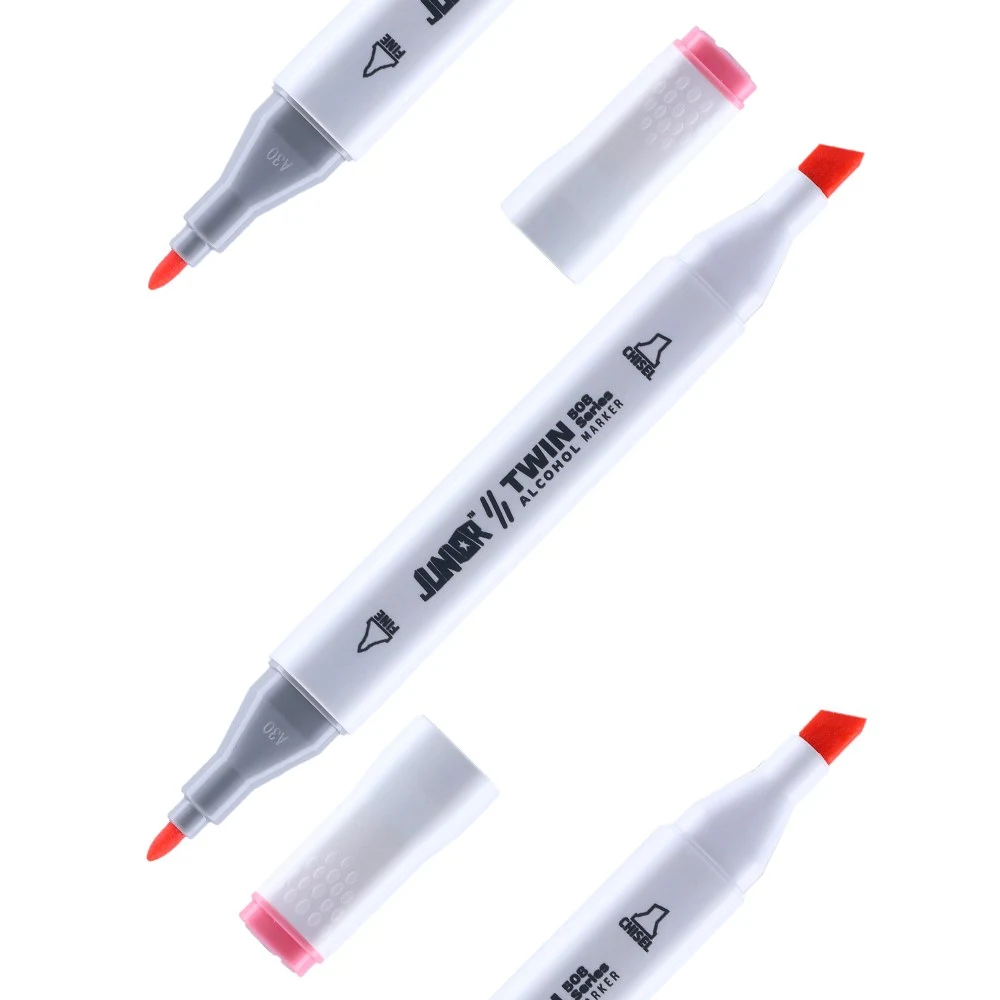 Twin 508 dual alcohol marker in rose pink. Sleek white barrel, durable plastic construction, color-coded caps with textured grip and clear tip icons. Two tips: fine bullet for detail, broad chisel for coverage. Delivers consistent color for professional artwork and drafting.