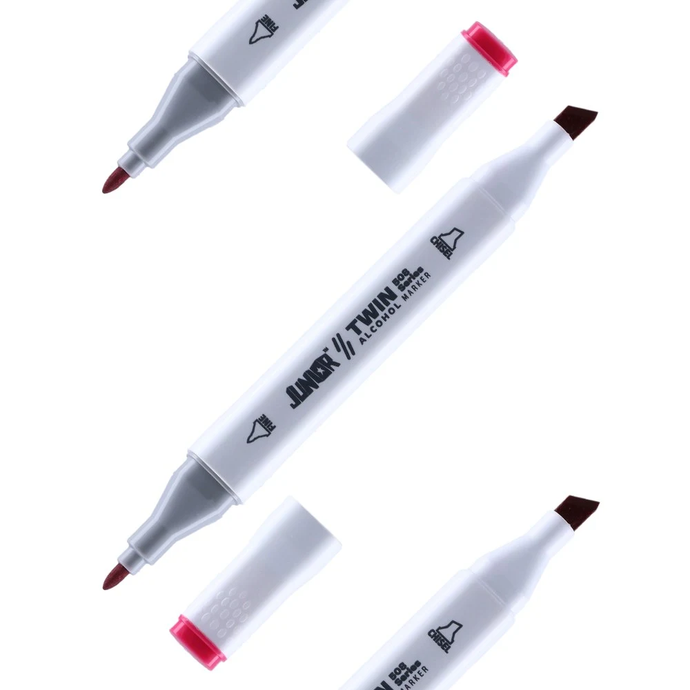 Twin 508 Alcohol Marker, Rose Red. Dual-tip design pairs a fine bullet nib with a broad chisel for line work and fills. Alcohol-based ink in rose red. Sleek white barrel with color-coded, textured caps and printed nib icons for quick ID; modern, shelf-ready presentation.