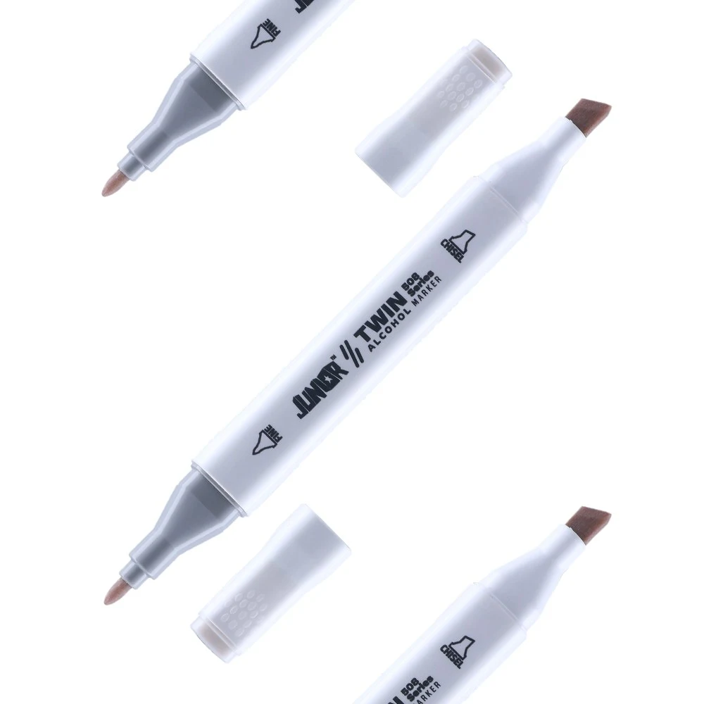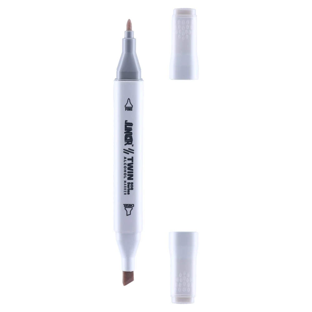 Twin 508 alcohol marker with dual tips for versatility: fine bullet for detail and broad chisel for coverage. Warm Grey WG0.5. Sleek white barrel with clear tip icons and textured caps for secure handling. Suited to professional sketching, rendering, and layout work.
