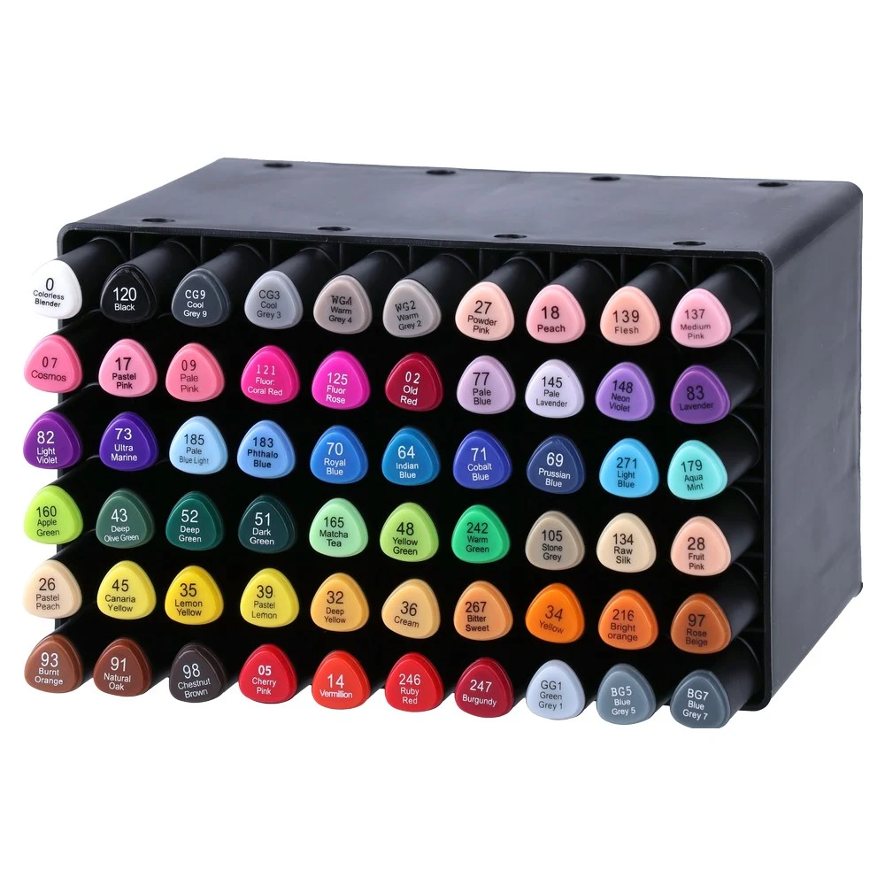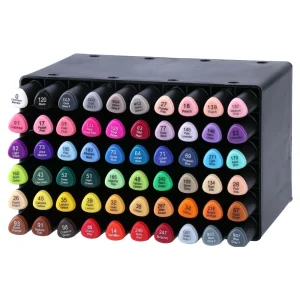 Twin 60 Alcohol Markers: a 60-piece, double-sided set for professional use. Fine and brush tips enable precision lines and smooth fills. Alcohol-based ink blends easily for seamless shades. Supplied in a sturdy box with marker stand and bold, shelf-ready design.