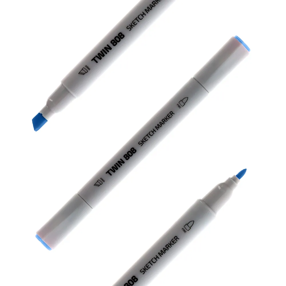 Twin 808 alcohol sketch marker, blue B48. Dual-tip marker with chisel and fine nibs for coverage and detail. Sleek white plastic barrel with printed icons; color-coded caps for fast identification. Professional look and versatility suit sets and studio kits.