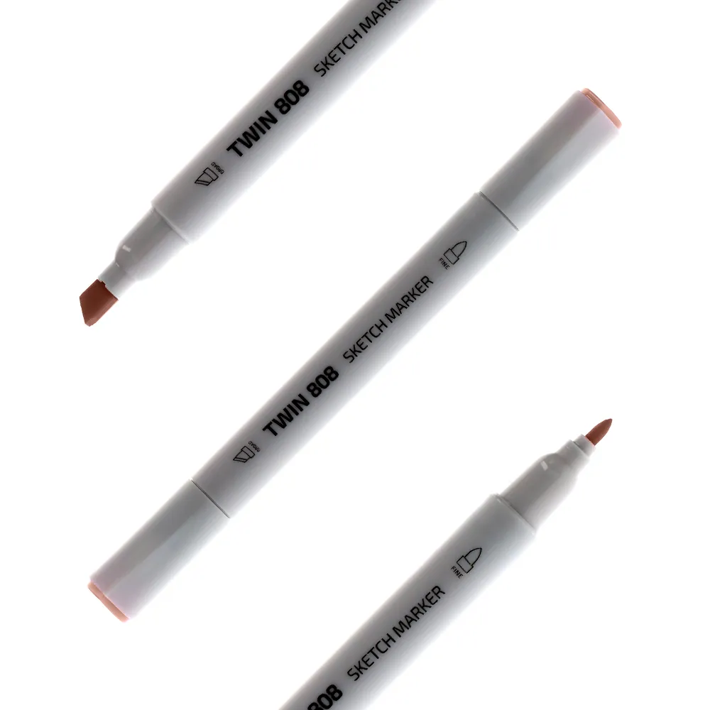 Twin 808 alcohol sketch marker, brown E54. Minimal white barrel with dual tips: chisel for coverage and fine for detail. Durable plastic body with tinted end caps for quick ID. Versatile, studio-ready choice for professional illustration and design.