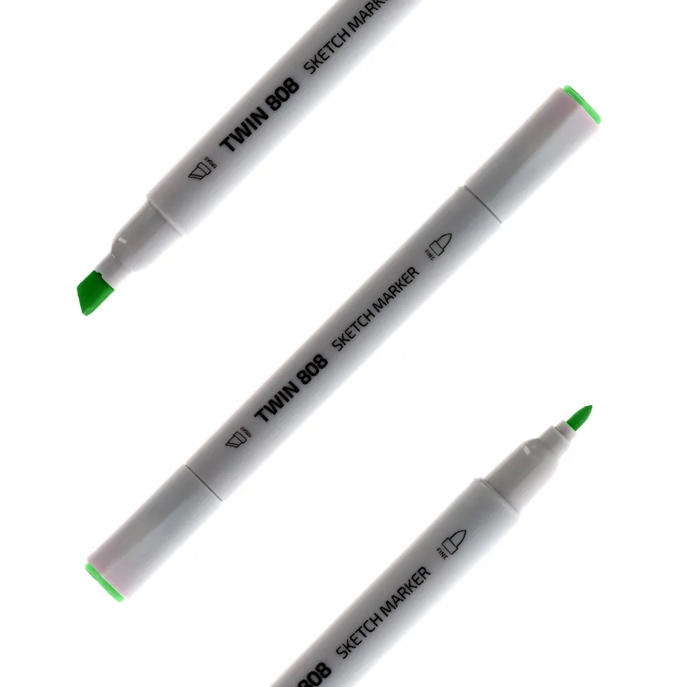 Twin 808 alcohol sketch marker in green G35. Dual tips: chisel for fills and fine for detail. Sleek white barrel with printed tip icons and color‑coded caps for quick selection. Vivid alcohol-based ink suited for professional design, illustration, and drafting workflows.