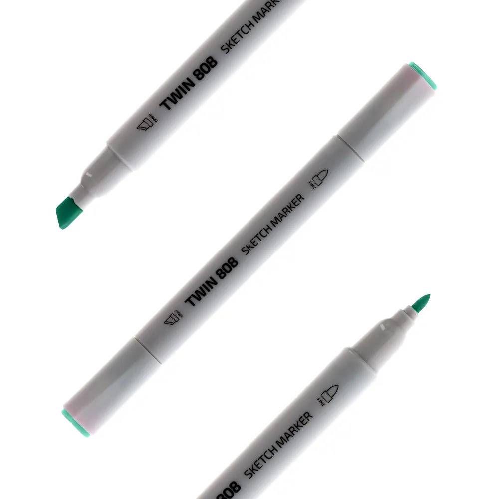 Twin 808, alcohol sketch marker in Green G78. Dual-tip design with chisel and fine nibs for fills and precision. Clean white plastic barrel with color-indicator caps and clear tip icons for fast selection. Durable, professional look suited to studio, drafting, and illustration use.