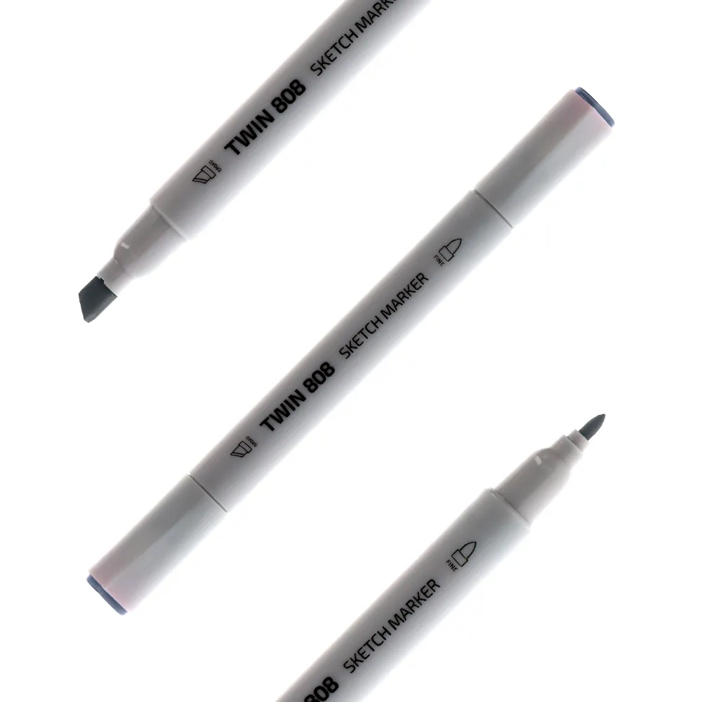 Twin 808 alcohol sketch marker, grey BG19. Dual-tip with chisel and fine nibs for broad fills and precise lines. Sleek white barrel with clear markings suits modern studio kits. Alcohol-based ink delivers smooth, even coverage for professional sketching, rendering, and drafts.
