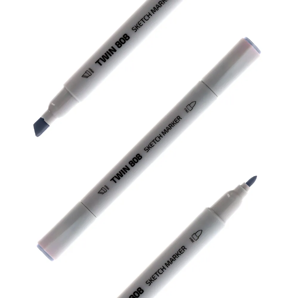 Twin 808 alcohol sketch marker, Grey C6. Dual-tip with chisel and fine nibs for broad strokes and precise lines. Clean white barrel with tip icons and color-marked caps suits modern studio kits and retail assortments. Durable plastic construction and a reliable grey tone.