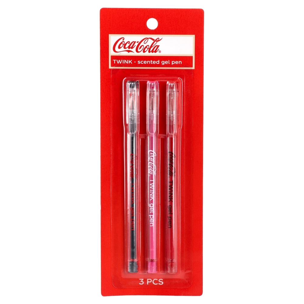 Twink gel pen set featuring Coca-Cola branding in neon tones. Three scented gel pens with smooth ink flow, translucent plastic barrels and clear clip caps. Supplied in a retail-ready blister card for eye-catching display and impulse sales. Ideal for stationery merchandising, gifting and brand-led promotions.