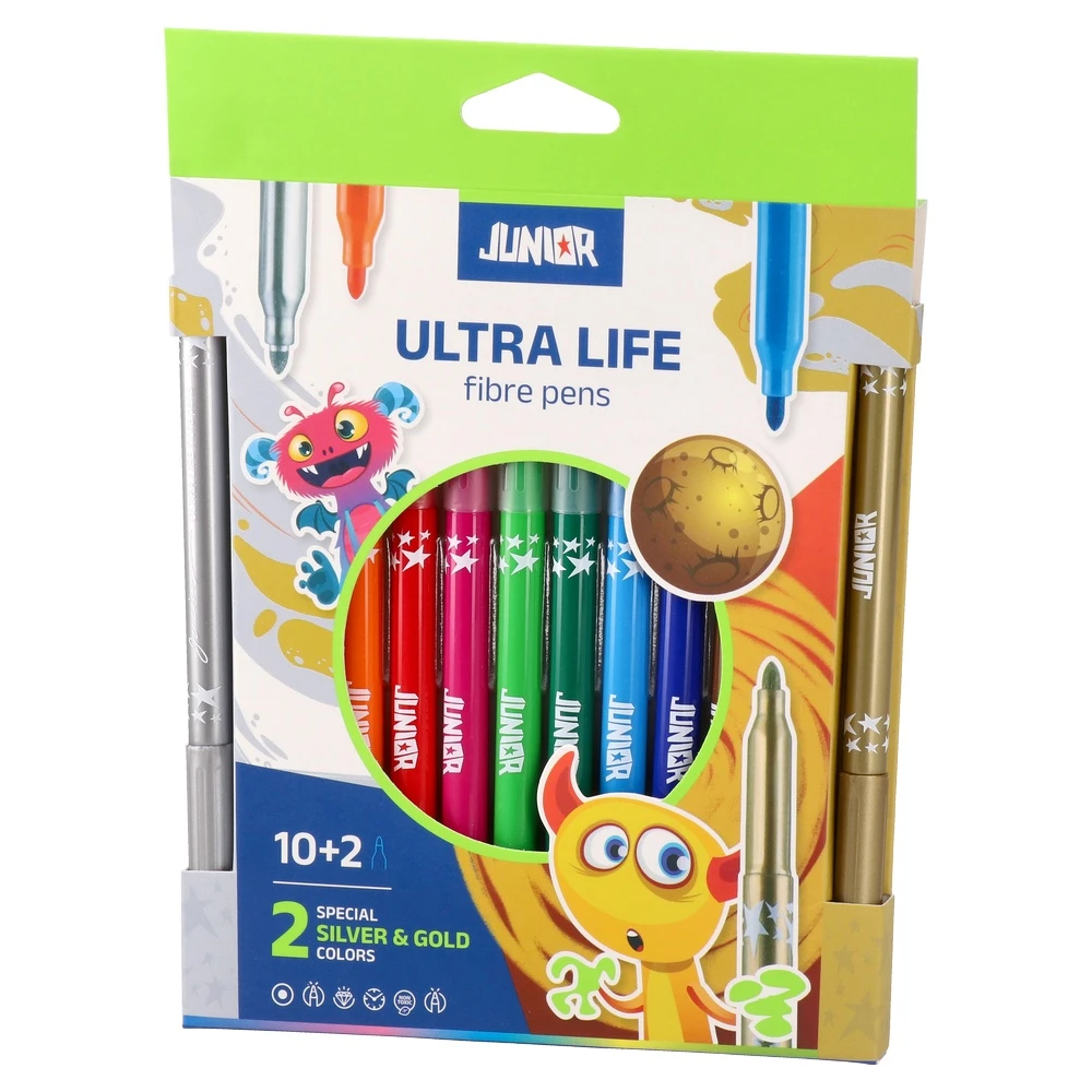 Ultra life, fibre pens, 10+2pcs delivers a vivid color set in a retail-ready hang pack. The 12 fibre pens include 10 assorted shades plus 2 special metallics: silver and gold. Trendy star-detailed barrels enhance shelf appeal, ideal for school and craft assortments.