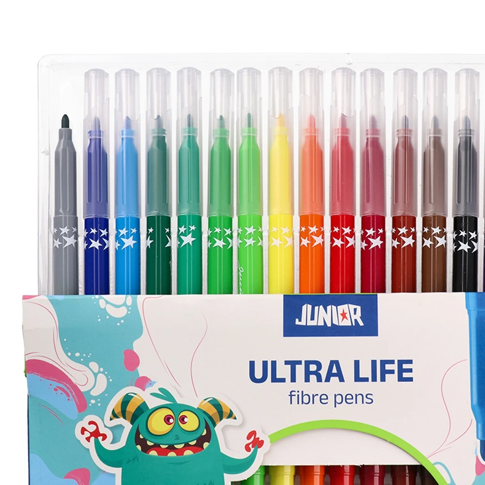 Set of 18 fibre pens in vivid assorted colors. Durable plastic barrels with printed branding. Windowed pack with playful graphics enhances shelf appeal. Fibre tips provide consistent lines; special long-life filling supports extended use. Retail-ready hang-tab packaging for easy display.