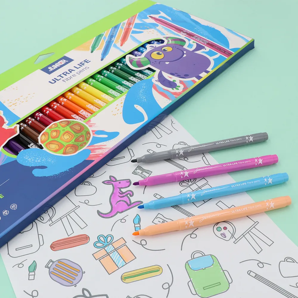 Set of 36 Ultra Life fibre pens in assorted vivid colours. Durable fibre tips and plastic barrels. Special long life filling indicated on pack. Windowed, hang-ready box showcases the palette and enhances shelf impact for retail while enabling quick color selection.