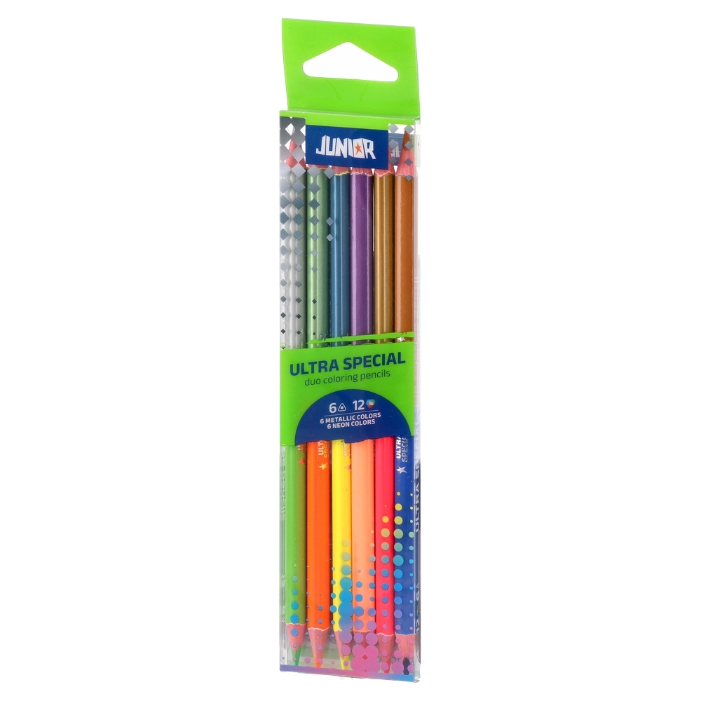 Ultra Special duo coloring pencils deliver 12 on-trend shades from 6 wood-cased pencils: 6 metallic and 6 neon. Dual-ended design maximizes value and saves space. Modern dotted barrels enhance shelf appeal, making a standout choice for art and creative assortments.