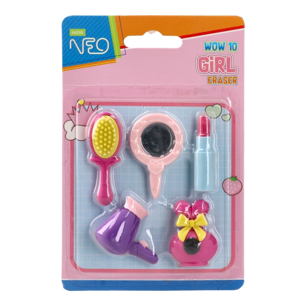 Wow 10, eraser, Girl is a 5-piece novelty eraser set shaped as beauty accessories—mirror, brush, lipstick, hair dryer, and perfume. Trendy pink‑purple palette and crisp detailing enhance shelf impact. Supplied on a peg-ready blister card, ideal for stationery assortments and impulse sales.