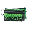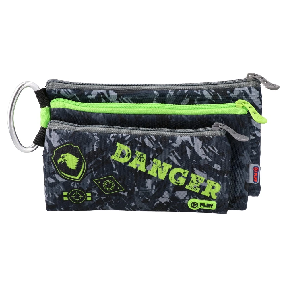 XL3, pencil bag, Military Code. Trend-driven dark camo with neon green details for standout appeal. Three stacked zip compartments keep stationery organized. Durable fabric and smooth zippers ensure daily reliability. Metal side ring allows easy attachment to bags or hooks.